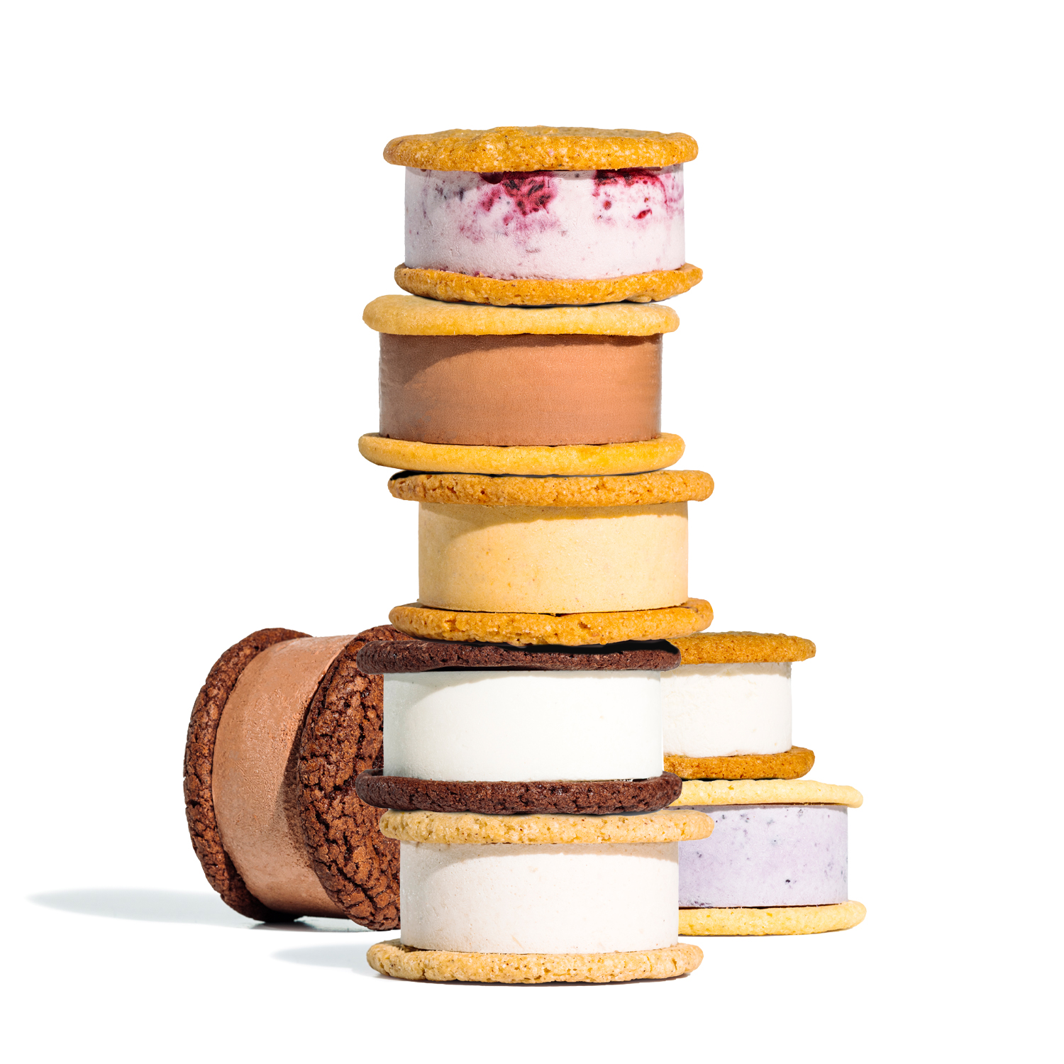 TWO EACH OF OUR BESTSELLING SANDWICHES: VANILLA CHOCOLATE, STRAWBERRY SHORTCAKE, PEANUT BUTTER CHOCOLATE, AND PEPPERMINT CHOCOLATE